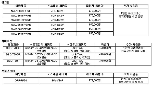 °°Àº ±â°£µ¿¾È ¼Ò´Ï µðÄ« ¡®»çÀ̹ö¼¦¡¯ DSC-T200(½Ç¹ö/·¹µå) ¹× DSC-T70(ÇÎÅ©)¿¡ ¸Þ¸ð¸®½ºÆ½, »ï°¢´ë, LCDº¸È£Çʸ§À¸·Î ±¸¼ºµÈ Á¹¾÷ÀÔÇÐ ÆÐŰÁö¸¦ ±¸¸ÅÇÏ´Â ¸ðµç °í°´¿¡°Ô´Â Á¤Ç°ÆÄ¿ìÄ¡(LCS-TWA)¸¦ ÃÖ´ë 30% ÇÒÀÎµÈ °¡°Ý¿¡ Á¦°øÇÏ´Â À̺¥Æ®¸¦ ½Ç½ÃÇÑ´Ù. ¶ÇÇÑ Àα⸸Á¡ Æ÷ÅäÇÁ¸°ÅÍ DPP-FP70 ±¸ÀԽà ÇÁ¸°ÅÍ Ä«Æ®¸®Áö¿Í ÇÔ²² ½ºÆä¼È ÆÐŰÁö¸¦ Ưº°ÇÒÀΰ¡¿¡ Á¦°øÇÑ´Ù.
