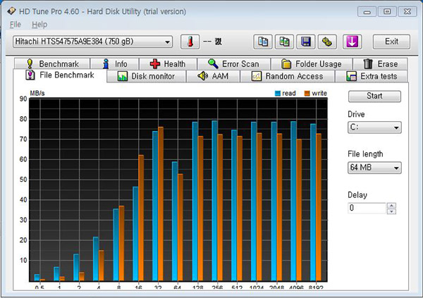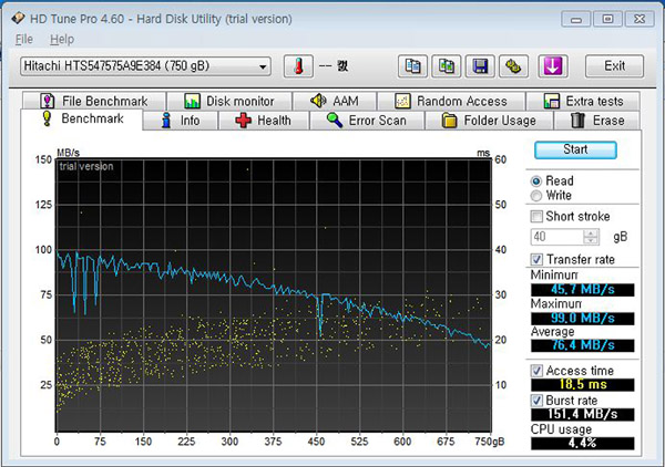 »çÁø¼³¸í : HDD Tune 4.6 ¹öÀüÀ» »ç¿ëÇÏ¿© ¸®ºä ¸ðµ¨¿¡ ±âº» ³»ÀåµÇ¾î ÀÖ´Â 750GB Çϵåµð½ºÅ©ÀÇ ¼º´ÉÀ» Å×½ºÆ®ÇÑ °á°úÀÔ´Ï´Ù.